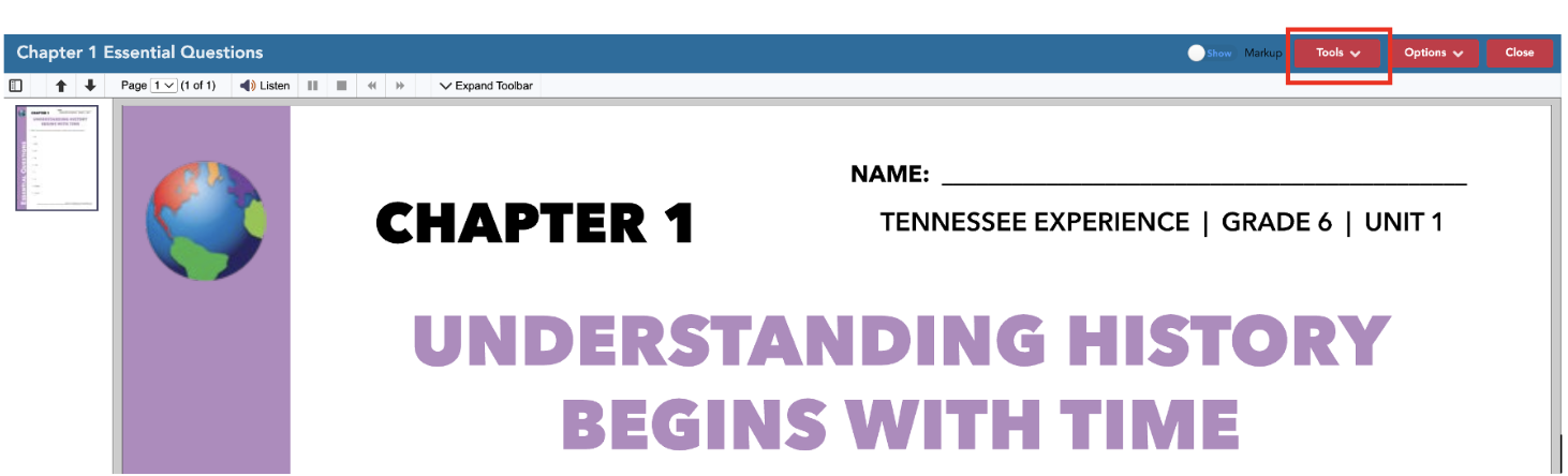 To complete a PDF+ assignment, students will open the assignment and select Tools from the top right.
