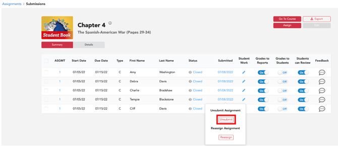 ***Unsubmitting allows students to edit/redo any activity included in the assignment. As stated above, when a teacher unsubmits an assignment submission, all previous grading will be deleted.